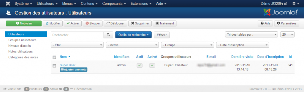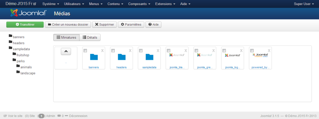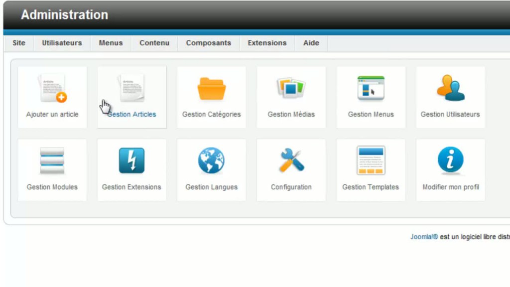 Pour Joomla, une interface simple avec des icônes directement sur la page d’administration pour aller là ou l’on veut.