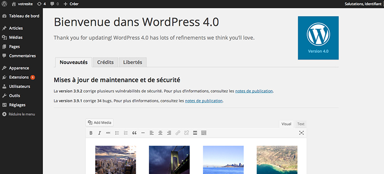 - Wordpress utilise la page d’accueil comme présentation des statistiques, nouveautés, brouillons et bien plus encore grâce à la personnalisation.