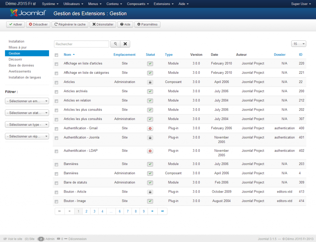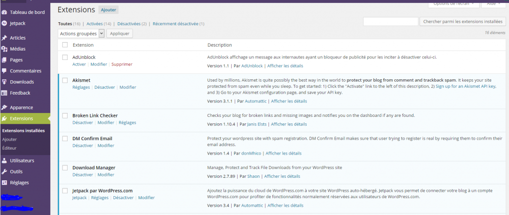 On télécharge les extensions sur le site ici pour le Français ou la pour l’international. Le site ici est pour les thèmes. Puis, on doit déposer les fichiers par FTP sur le serveur et enfin on active l’extension ou le thème.