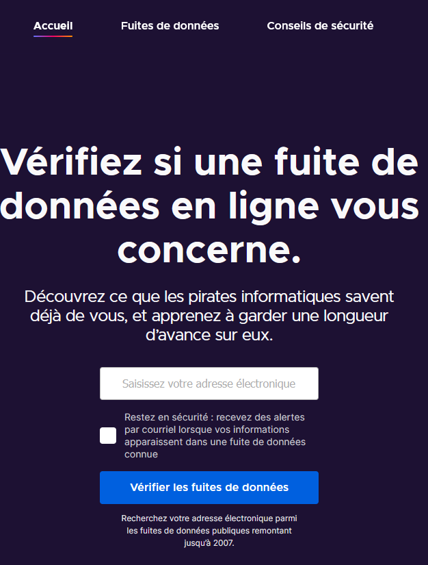 A l’accueil vous pouvez vérifier les données volées à partir de vos email