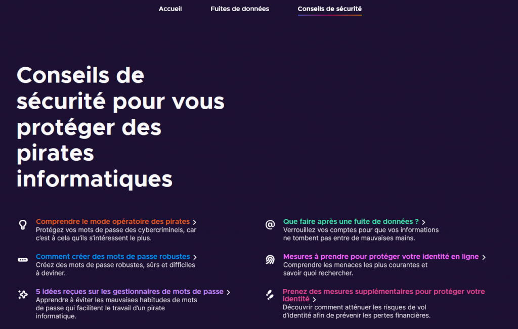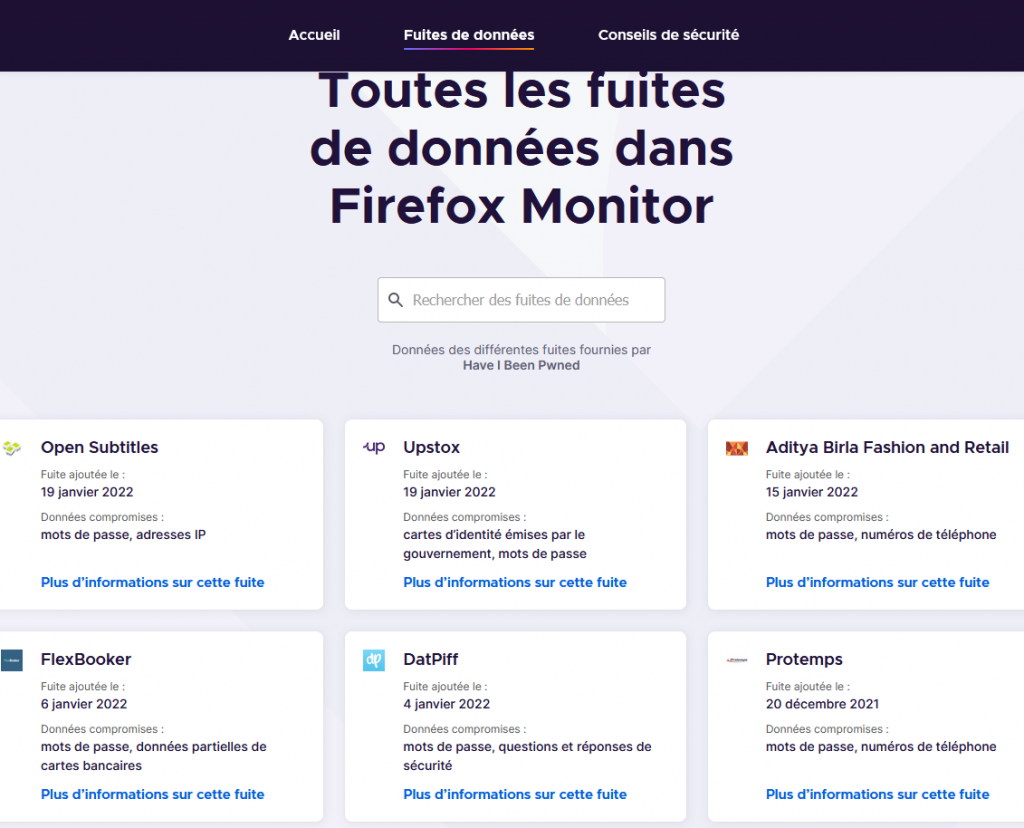 A l’onglet fuites de données, vous verrez les informations sur les dernières fuites de données recensées par Mozilla